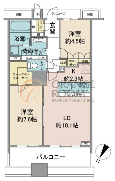 | 間取り | 2LDK (K2.9帖 , LD約10.1帖、洋室約7.6帖、約4.5帖) | ||