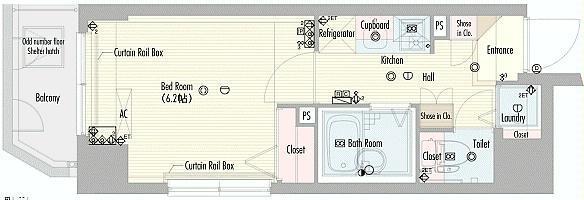 | 間取り | 1K (K2帖 , 洋室6.2帖) | ||