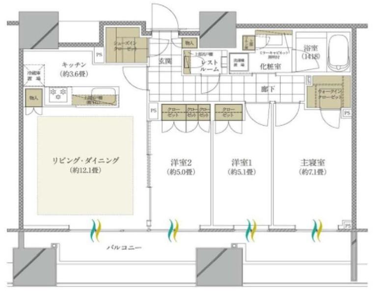 | 間取り | 3LDK (LD12.1帖 , K3.6帖, 洋室7.1帖・5.1帖・5.0帖) | ||