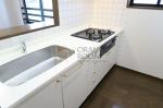 キッチンは2口ガスコンロ設置済み。サイドカウンター付きで調理や配膳にとても便利です。