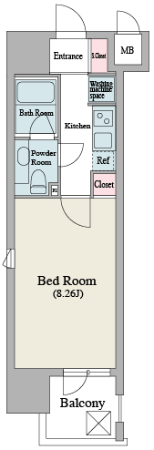 | 間取り | 1K (K , 洋室8.26帖) | ||