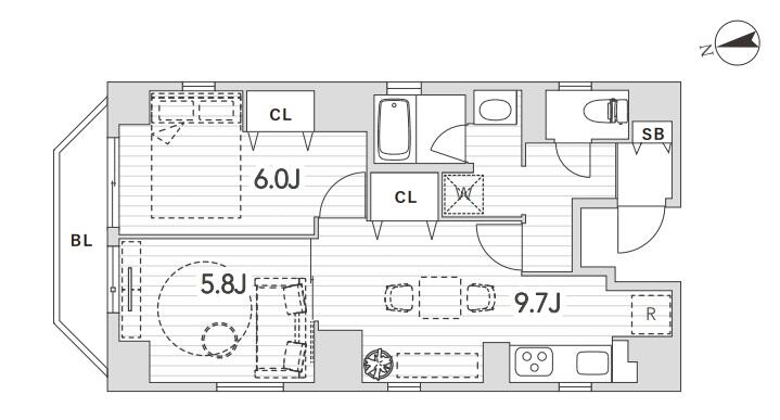 | 間取り | 2LDK (LDK9.7帖 , 洋室6.0帖・5.8帖) | ||