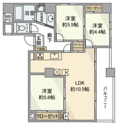 | 間取り | 3LDK LDK10.5帖 , 洋室5.6帖・5.5帖・4.4帖 | ||