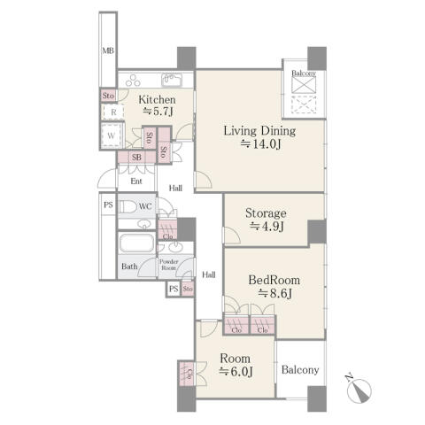 間取り | 2SLDK LD14帖 , K5.7帖 , 洋室8.6帖・6.0帖 , S4.9帖 | ||
